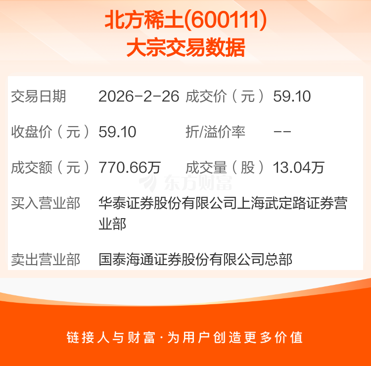 大宗交易:北方稀土成交770.66万元(2-26)