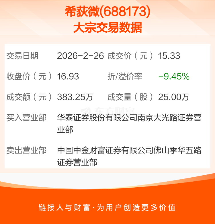2026年2月26日,希荻微发生1笔大宗交易,共成交25.00万股,成交金额383.25万元,占其流通市值比例为0.06%。