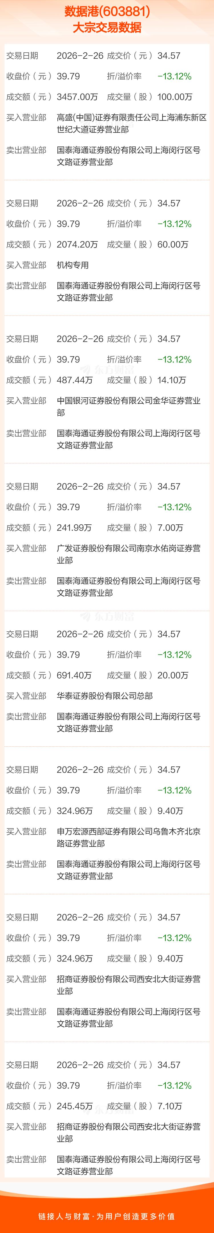 2026年2月26日,数据港发生8笔大宗交易,共成交227.00万股,成交金额7847.40万元,占其流通市值比例为0.27%。
