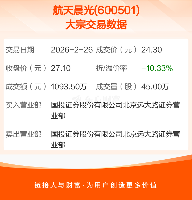 2026年2月26日,航天晨光发生1笔大宗交易,共成交45.00万股,成交金额1093.50万元,占其流通市值比例为0.09%。