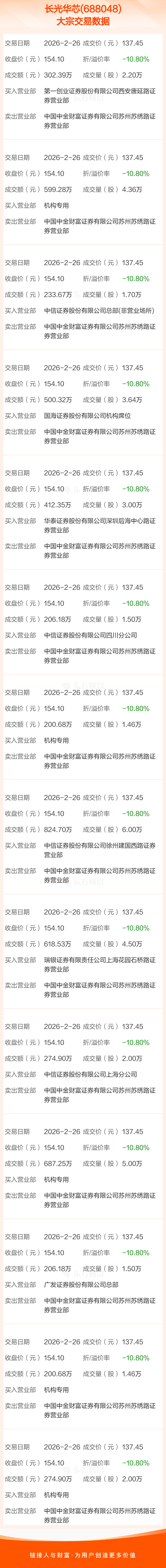 大宗交易:长光华芯成交5542.01万元,折价10.80%(2-26)