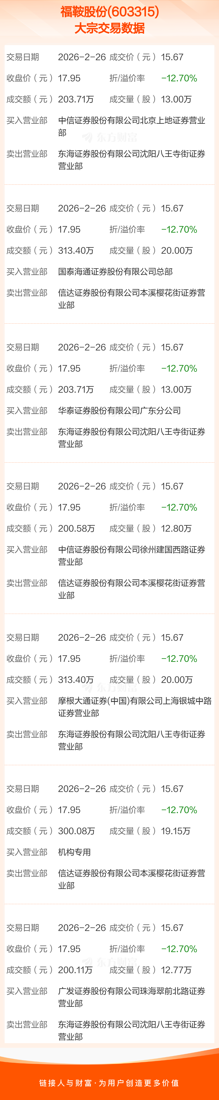2026年2月26日,福鞍股份发生7笔大宗交易,共成交110.72万股,成交金额1734.99万元,占其流通市值比例为0.30%。