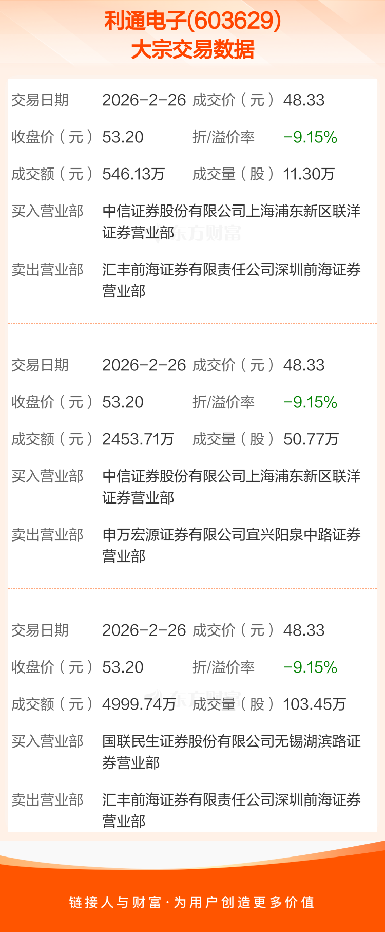 2026年2月26日,利通电子发生3笔大宗交易,共成交165.52万股,成交金额7999.58万元,占其流通市值比例为0.59%。