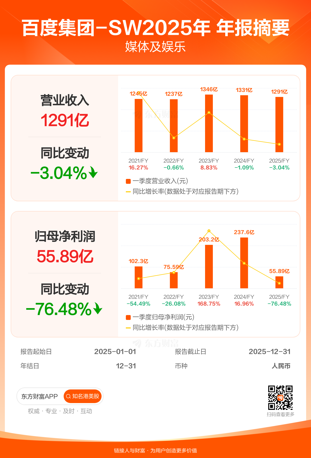 百度集团-SW2月26日发布年报业绩,截至2025年12月31日的12个月内,该公司营业收入1290.79亿人民币,同比减少3.04%;公司权益持有人应占溢利(归母净利润)55.89亿人民币,同比减少76.48%,低于机构一致预测的178.31亿人民币。