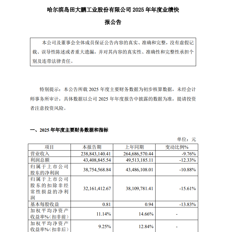 2月26日,大鹏工业(920091)发布公告,2025年年度业绩快报显示,公司营业收入为2.39亿元,同比下降9.76%;归母净利润为3875万元,同比下降10.88%;基本每股收益为0.81元,同比下降13.83%;归母净利润扣除非经常性损益后为3216万元,同比下降15.61%。