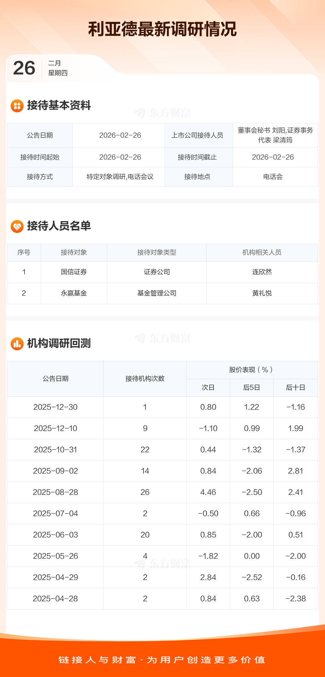 利亚德2月26日公告称,2月26日接待国信证券等2家机构调研。接待人员包括董事会秘书 刘阳,证券事务代表 梁清筠。