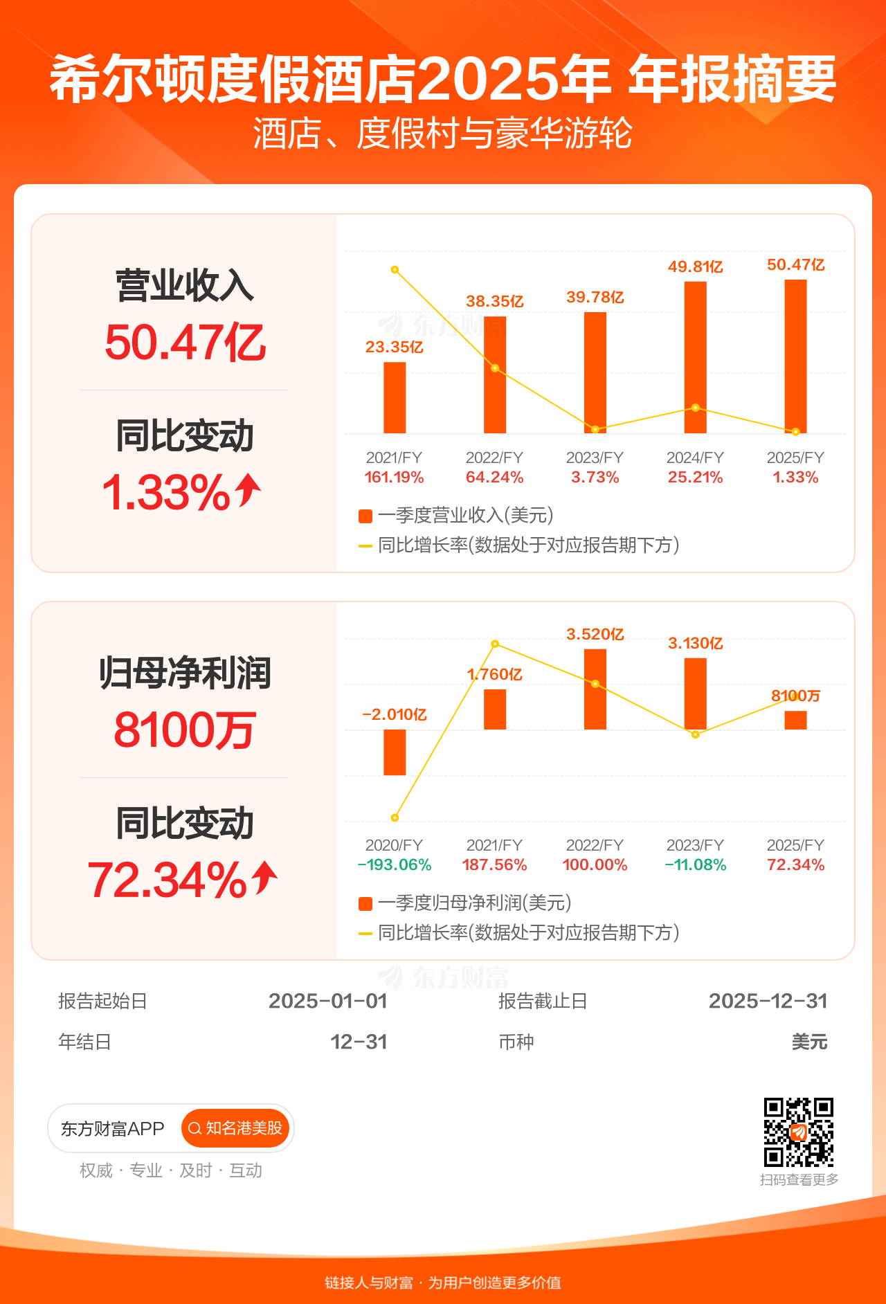 希尔顿度假酒店2月26日发布年报业绩,截至2025年12月31日的12个月内,该公司营业收入50.47亿美元,同比增长1.33%;公司权益持有人应占溢利(归母净利润)8100.00万美元,同比增长72.34%。