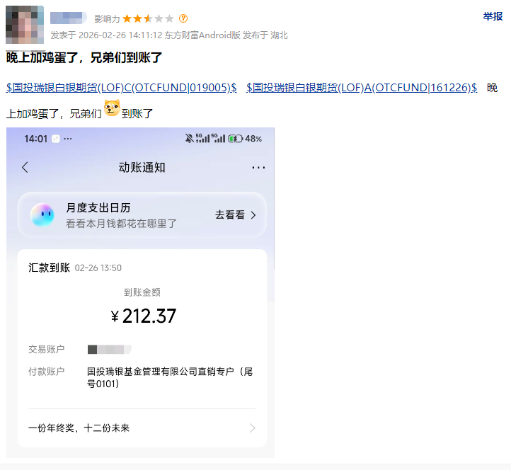 当天下午,已有投资者晒出补偿金额到账的截图。随着白银LOF事件告一段落,也有投资者提出疑问:“没有赎回的投资者,为何不补偿?”“场内交易的投资者为何不补偿?”