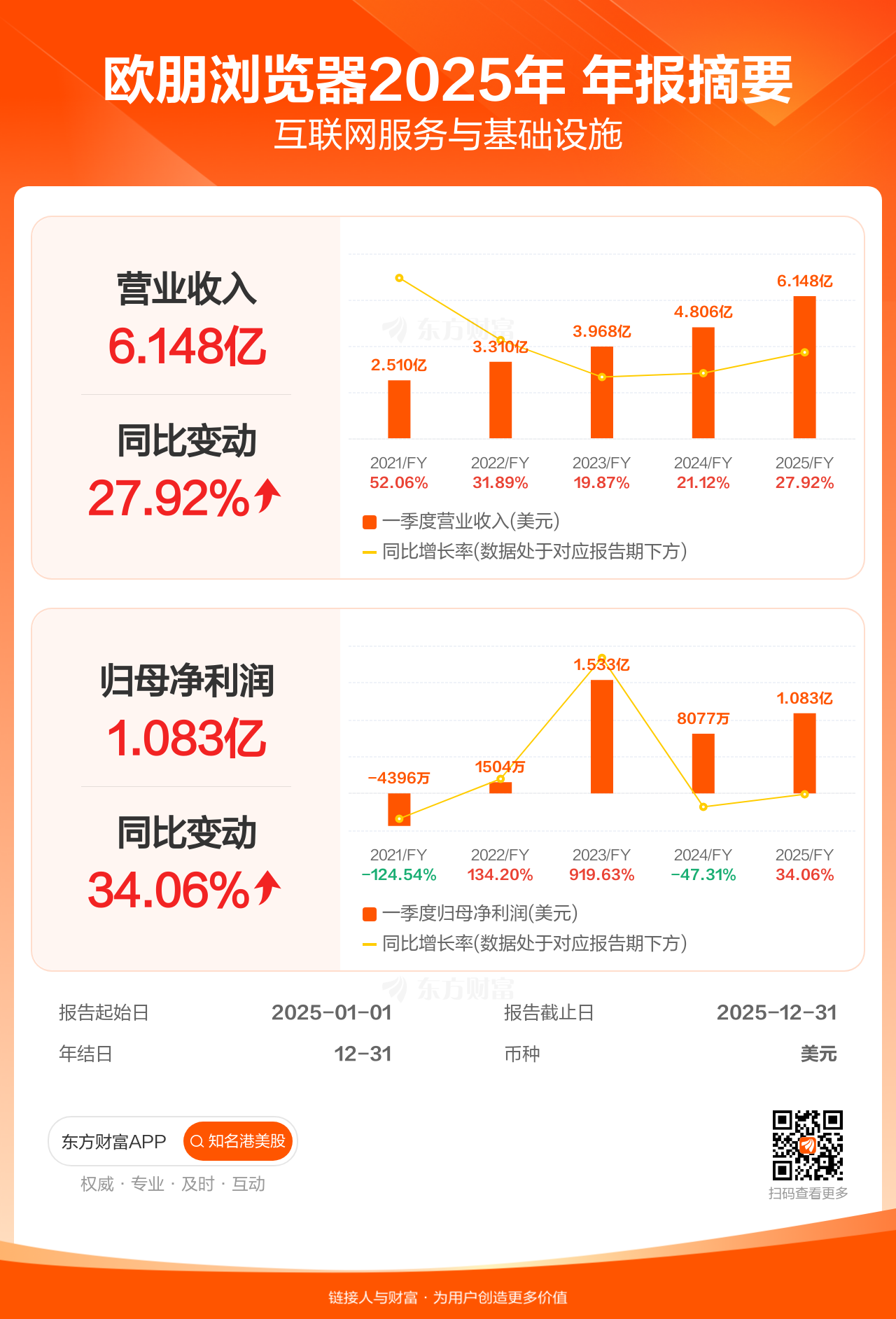 欧朋浏览器2月26日发布年报业绩,截至2025年12月31日的12个月内,该公司营业收入6.15亿美元,同比增长27.92%;公司权益持有人应占溢利(归母净利润)1.08亿美元,同比增长34.06%,低于机构一致预测的1.13亿美元。