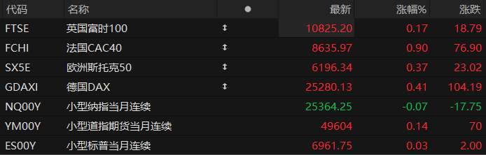 周四盘前,美股三大股指期货震荡盘整,欧洲主要指数普遍上涨。截至发稿,纳斯达克100指数期货跌0.07%,道指期货涨0.14%,标普500指数期货涨0.03%。