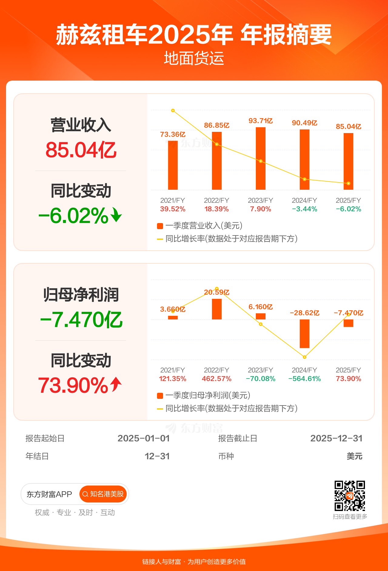 赫兹租车2月26日发布年报业绩,截至2025年12月31日的12个月内,该公司营业收入85.04亿美元,同比减少6.02%;公司权益持有人应占溢利(归母净利润)-7.47亿美元,上年同期-28.62亿美元。