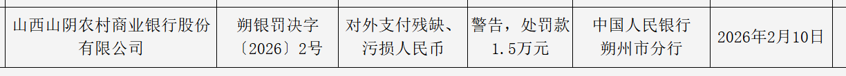 山西山阴农商行被罚1.5万,涉对外支付残缺、污损人民币
