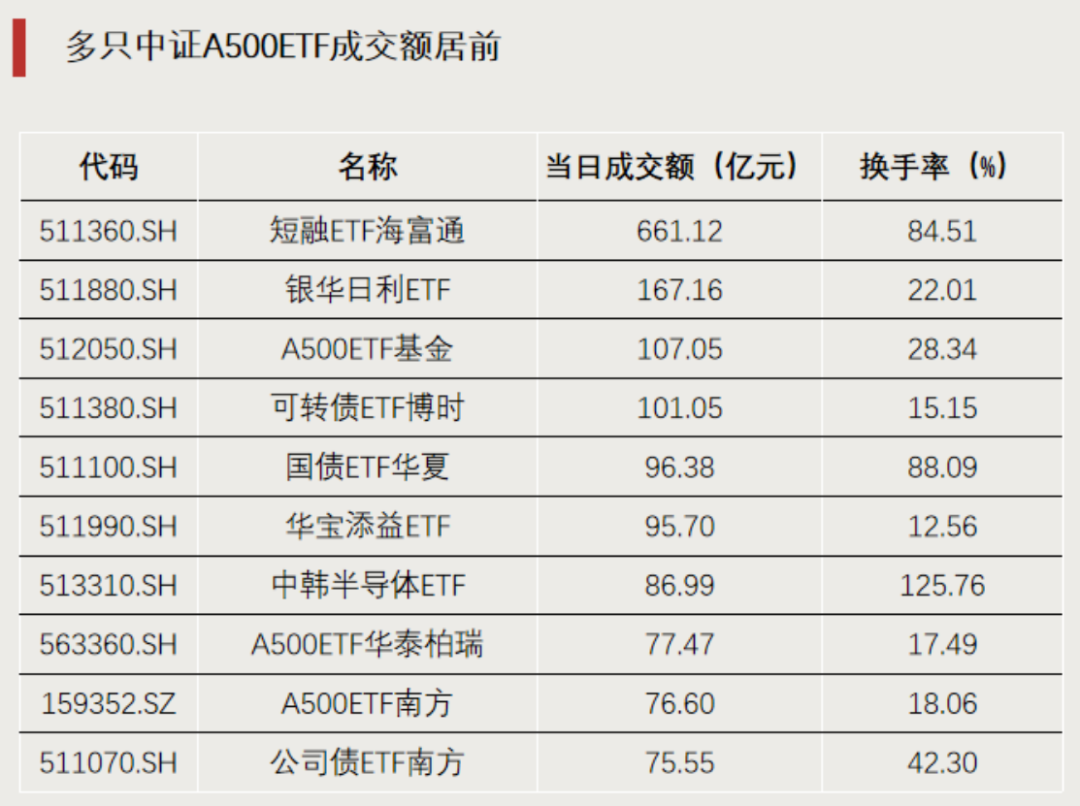权益类ETF方面,A500ETF基金(512050)、A500ETF华泰柏瑞(563360)、A500ETF南方(159352)等多只中证A500ETF成交额居前。中韩半导体ETF(513310)换手率达125.76%,交投活跃。
