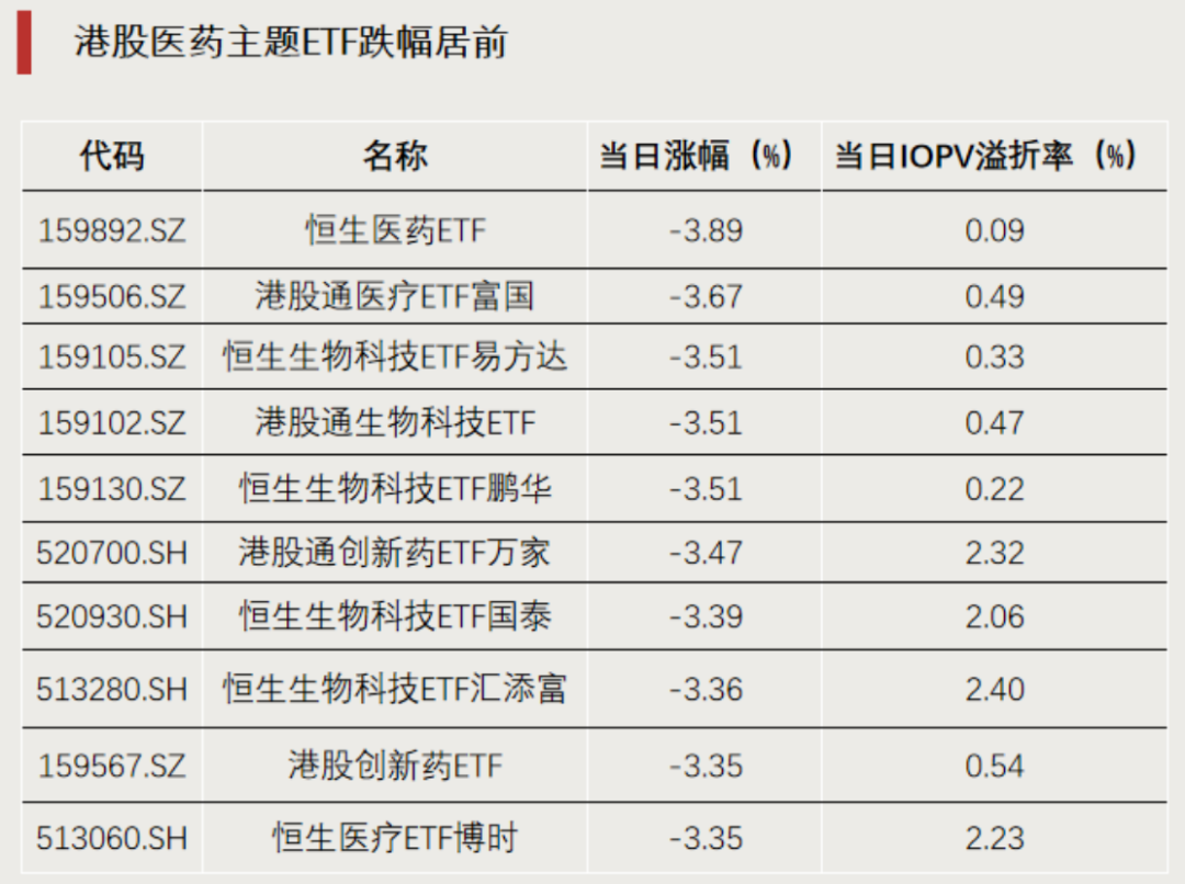 影视院线、保险、房地产等板块跌幅居前,港股医药板块大幅下挫,多只港股医药主题ETF跌超3%。
