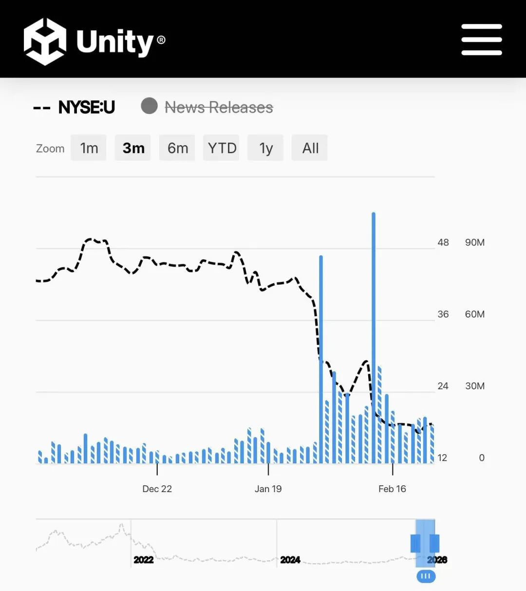 事实上,在披露最新财报以前,今年来,Unity的股价已因美股SaaS板块的集体抛售而遭受重创。截至2025年12月31日,Unity股价尚报收44.17美元/股;而到今年2月23日,其盘中最低已跌至16.78美元。