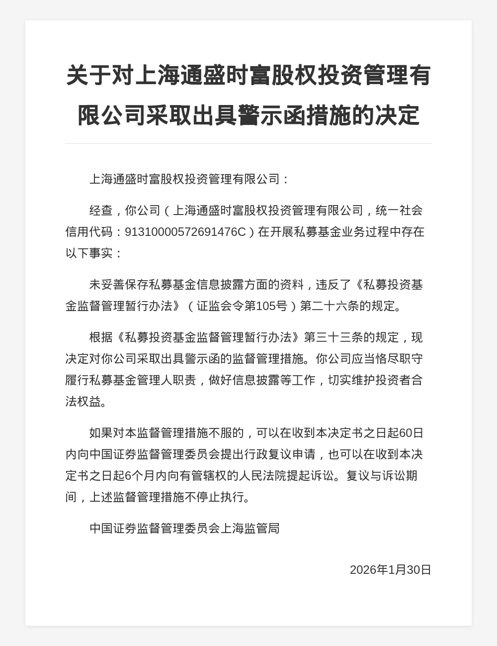 对此,中国证券监督管理委员会上海监管局现决定对上海通盛时富股权投资管理有限公司采取出具警示函的监督管理措施。