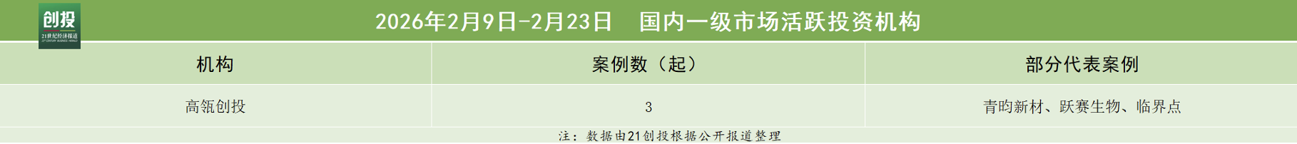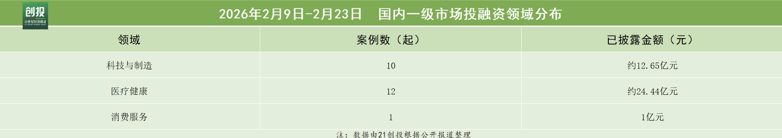21创投不完全统计,2026年2月9日—2月23日,国内一级市场共披露融资事件23起,覆盖科技与制造、医疗健康、消费服务三大领域。其中有16笔融资披露了融资金额和币种信息,披露融资总规模超38.09亿元人民币,大额融资集中在先进制造、生物医药等赛道。
