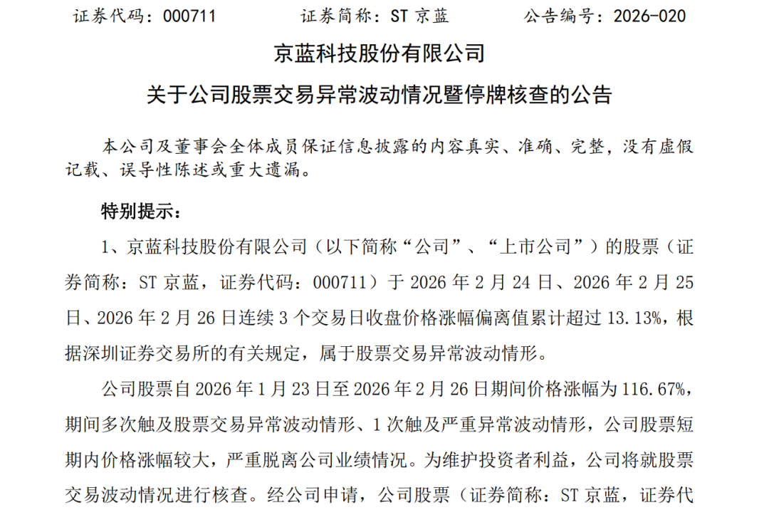 2月26日,ST京蓝发布公告称,公司股票于2月24日至26日连续3个交易日收盘价格涨幅偏离值累计超过13.13%,属于股票交易异常波动。