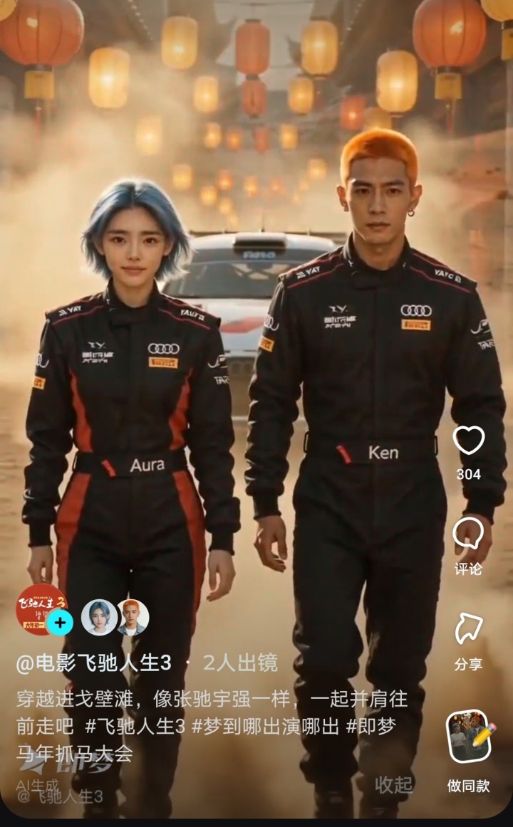 在即梦AI平台上,有大量普通人的造梦视频。借助AI工具,用户可以生成复杂的表演、专业的运镜和行云流水的武打动作,电影《飞驰人生3》等也提供影片素材模板,便于用户拍摄同款或改编,无形中成为一种营销方式。