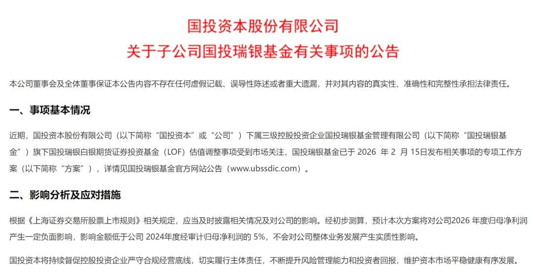 当日盘后,国投瑞银基金称,国投白银LOF主要投资于上期所挂牌交易的白银期货合约。鉴于近期白银国际主要市场价格出现显著波动,与上期所白银期货差异较大。根据相关规定,为保护基金持有人利益,确保基金净值能够真实、公允地反映底层资产状况,公司经与相关基金托管人协商一致,决定参考白银期货国际主要市场的价格变动幅度,对基金资产进行合理重估。