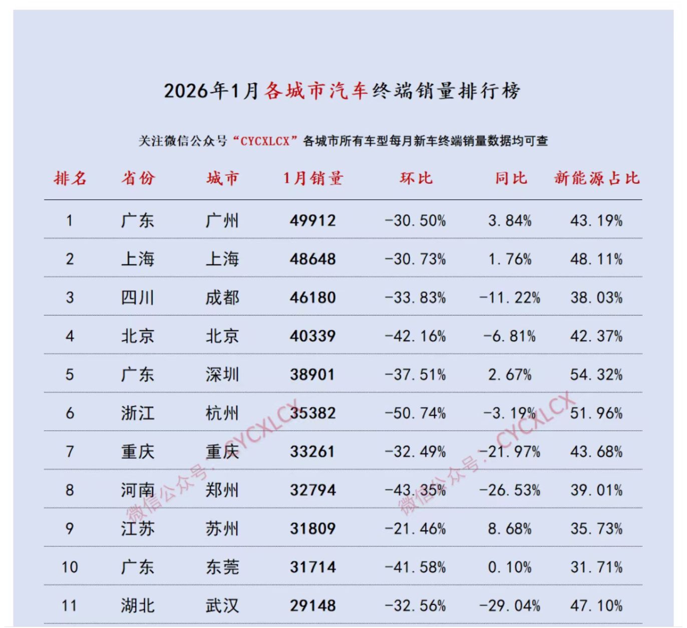 2026年1月,广州、上海和成都以突破4.5万辆的月销成绩,构成当月各城市汽车销量排行榜上的第一梯队,在其之后的北京(4.03万辆)和深圳(3.89万辆)分列第四、五位。