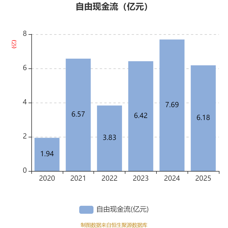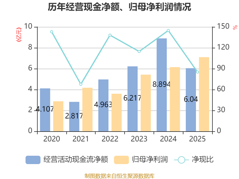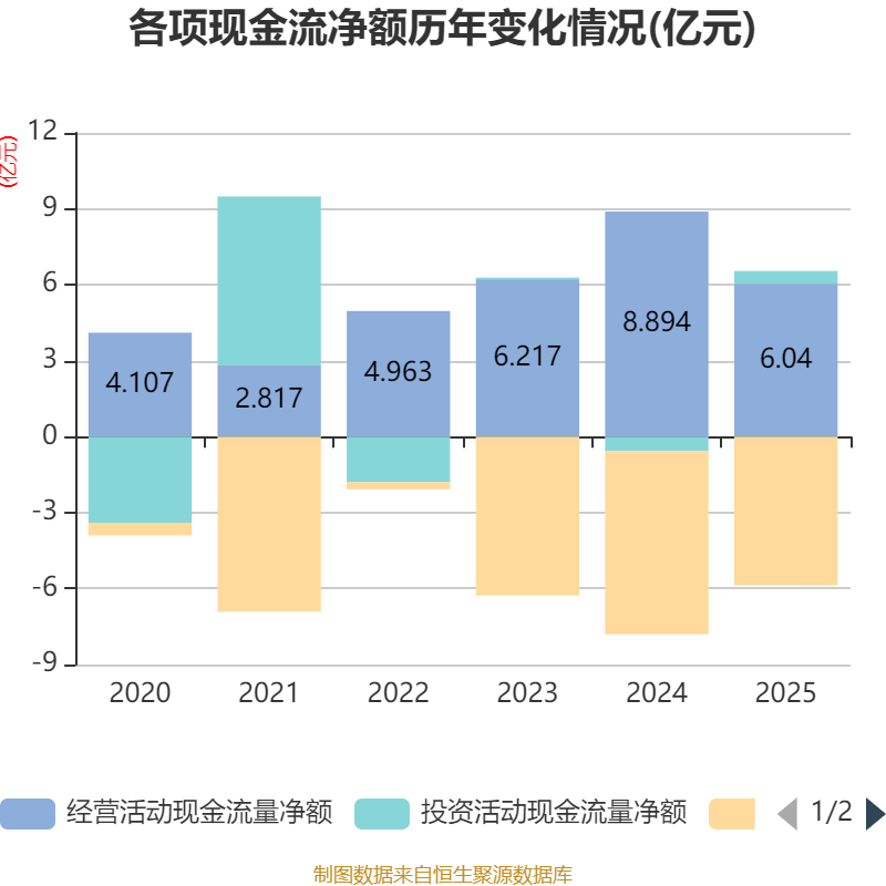 截至2025年,公司经营活动现金流净额为6.04亿元,同比下降32.08%;筹资活动现金流净额-5.87亿元,同比增加1.37亿元;投资活动现金流净额5052.9万元,上年同期为-5704.7万元。