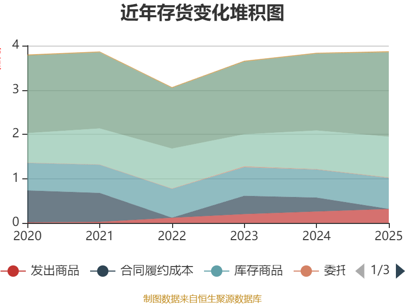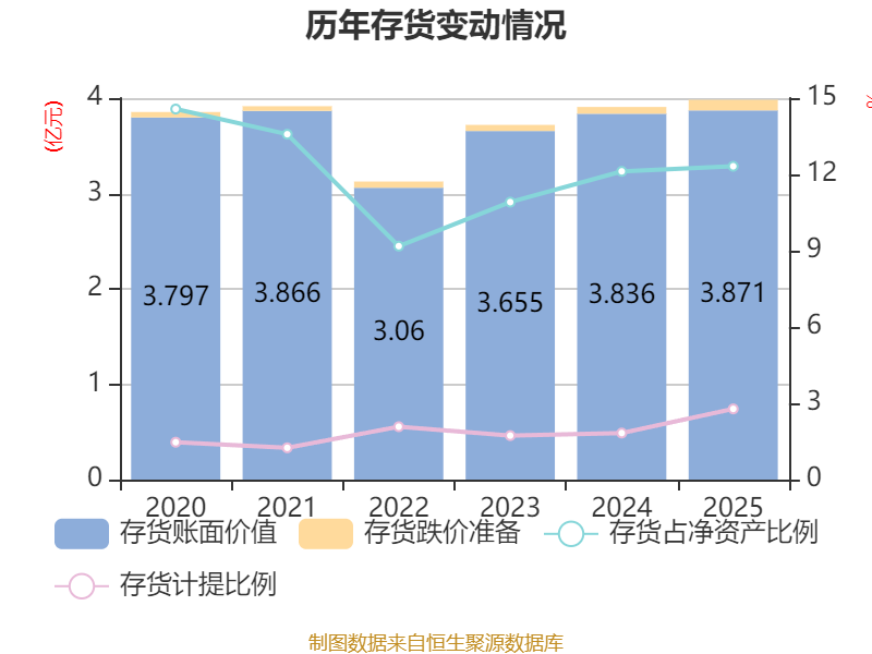 从存货变动来看,截至2025年末,公司存货账面价值为3.87亿元,占净资产的12.32%,较上年末增加352.09万元。其中,存货跌价准备为1108.35万元,计提比例为2.78%。