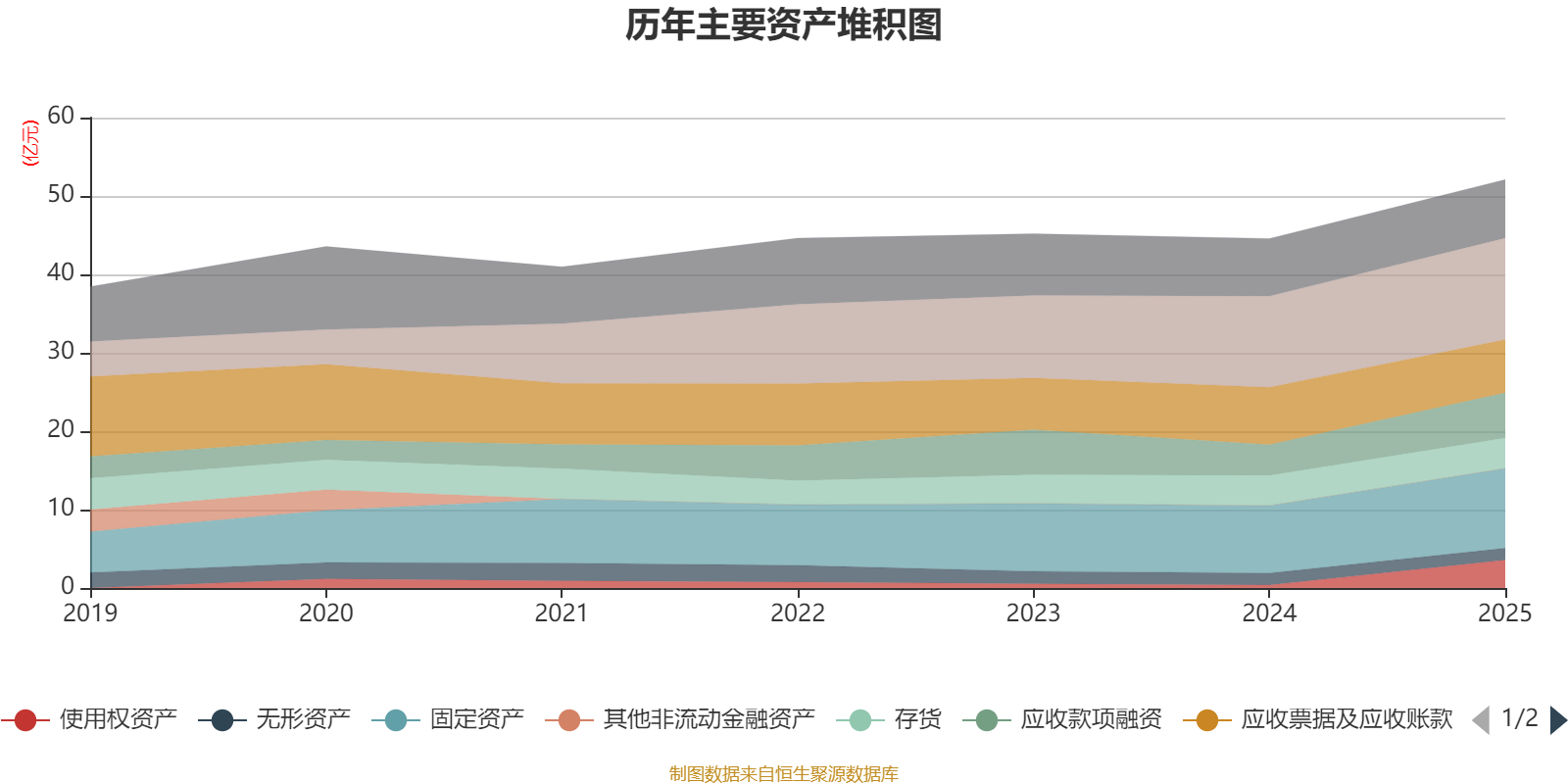 资产重大变化方面,截至2025年末,公司使用权资产较上年末增加880.61%,占公司总资产比重上升6个百分点;应收票据及应收账款较上年末减少7%,占公司总资产比重下降3.34个百分点;划分为持有待售的资产较上年末减少100%,占公司总资产比重下降2.88个百分点;应收款项融资较上年末增加46.31%,占公司总资产比重上升2.23个百分点。