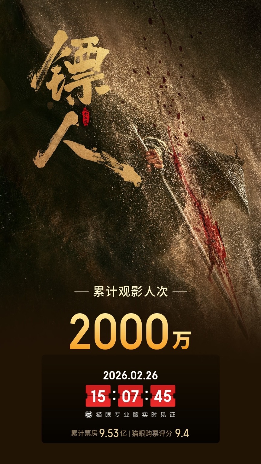 据猫眼专业版数据,电影《镖人:风起大漠》上映10天,观影人次破2000万。