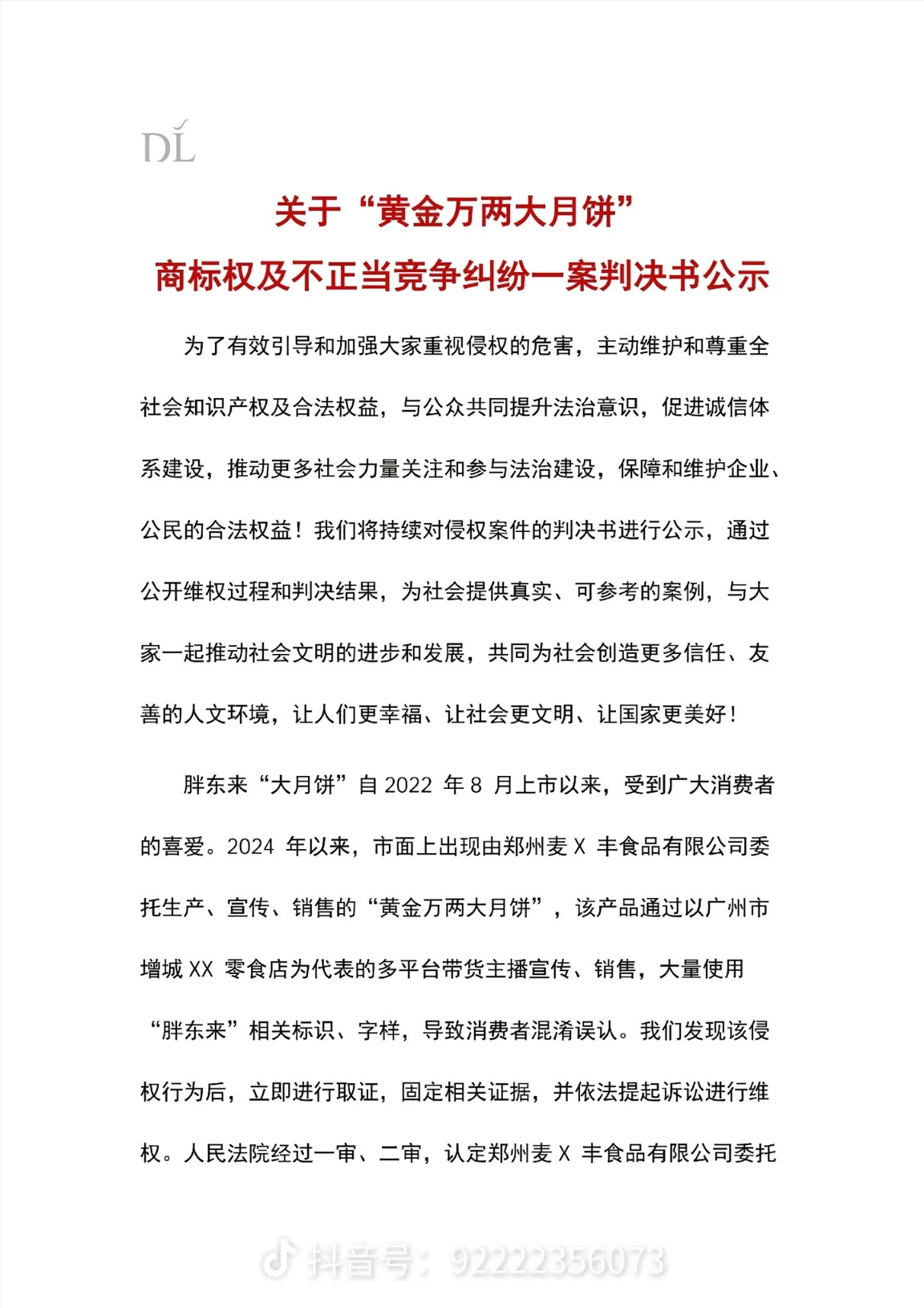 2月25日晚,胖东来官方账号发布关于“黄金万两大月饼”商标权及不正当竞争纠纷一案判决书公示,公示中提到,2024年以来,市面上出现由郑州麦X丰食品有限公司委托生产,宣传,销售的“黄金万两大月饼”,该产品通过以广州市增城XX零食店为代表的多平台带货主播宣传,销售,大量使用“胖东来”相关标识,字样,导致消费者混淆误认。胖东来发现该侵权行为后,立即进行取证,固定相关证据,并依法提起诉讼进行维权。