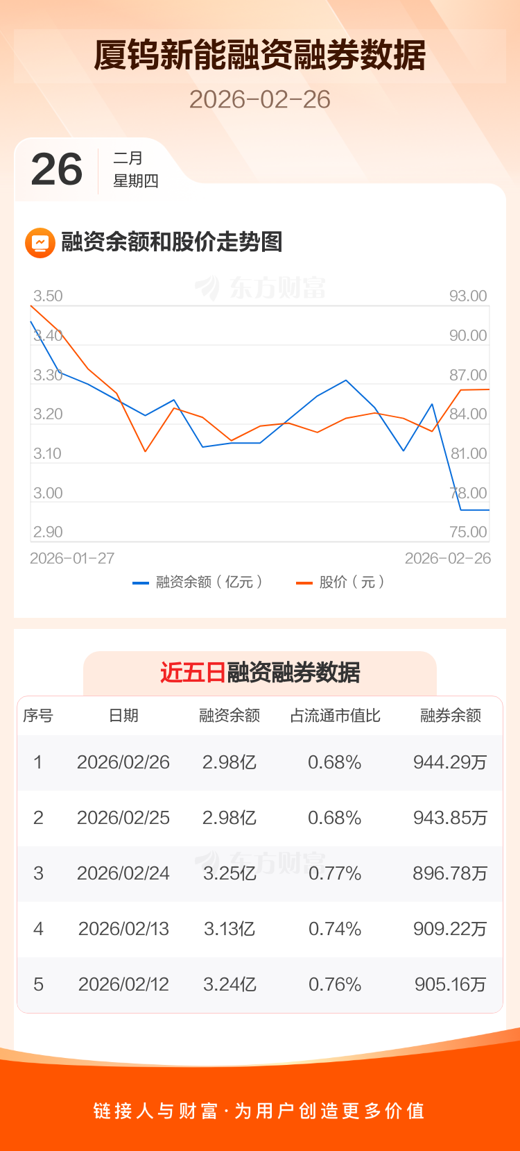交易所最新数据显示,厦钨新能于2026年2月26日获融资买入2592.54万元,融资偿还2662.13万元,当日融资净偿还69.58万元。目前,该股融资余额2.98亿,占流通市值比例为0.68%。