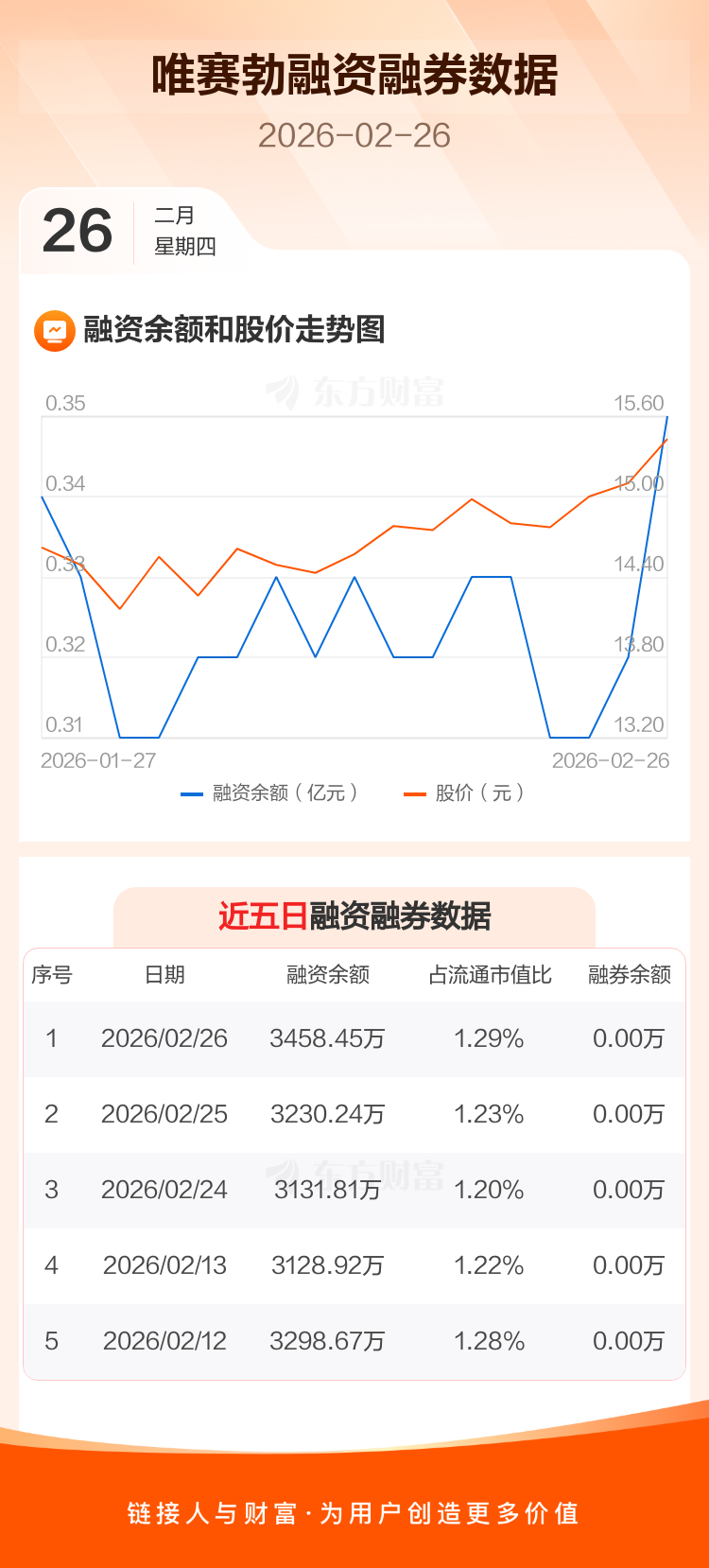 交易所最新数据显示,唯赛勃于2026年2月26日获融资买入507.95万元,融资偿还279.74万元,当日融资净买入228.21万元。目前,该股融资余额3458.45万,占流通市值比例为1.29%。