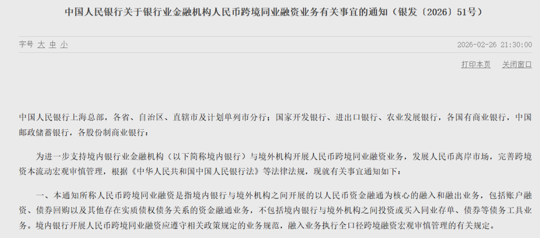为提升资本项目开放水平,发展人民币离岸市场,完善跨境资本流动宏观审慎管理,2月26日,中国人民银行(下称“央行”)发布《关于银行业金融机构人民币跨境同业融资业务有关事宜的通知》(下称《通知》),进一步支持境内银行业金融机构(下称“境内银行”)与境外机构规范开展人民币跨境同业融资业务。《通知》自发布之日起实施。
