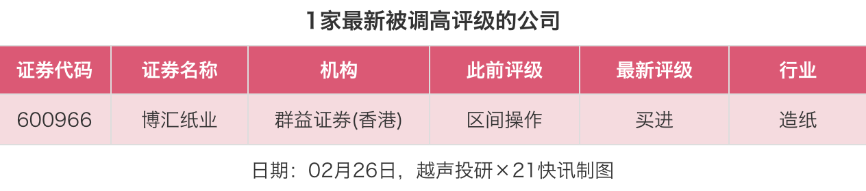 评级调高方面,2月26日,券商调高上市公司评级1家次,群益证券(香港)对博汇纸业的评级从“区间操作”调高至“买进”。