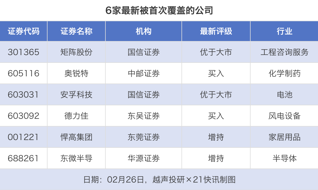 首次覆盖方面,2月26日券商共给出了6次首次覆盖,其中矩阵股份、安孚科技获得国信证券分别给予“优于大市”评级,奥锐特获得中邮证券给予“买入”评级,德力佳获得东吴证券给予“买入”评级,悍高集团获得东莞证券给予“增持”评级。