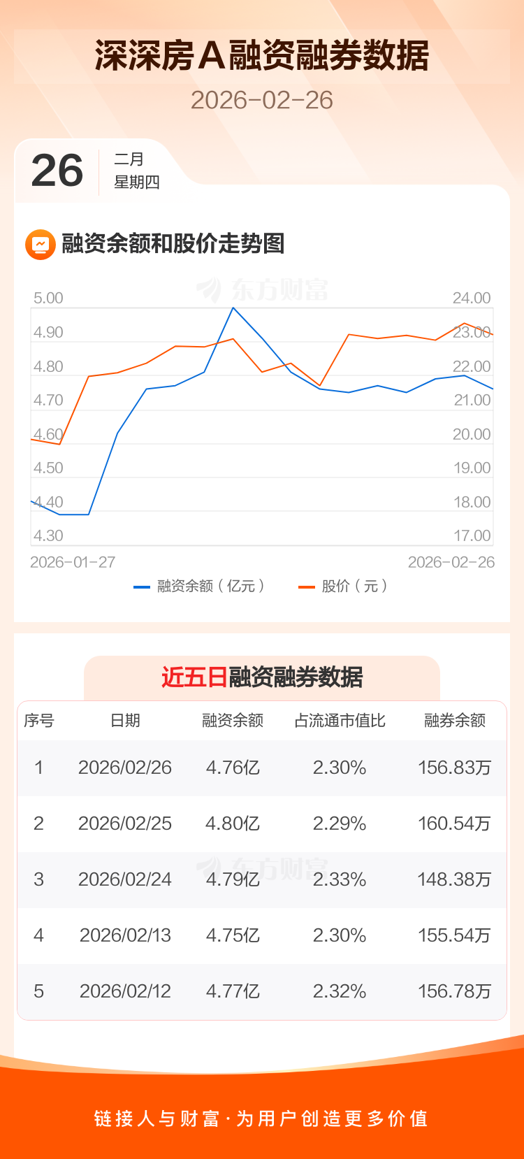 交易所最新数据显示,深深房A于2026年2月26日获融资买入882.49万元,融资偿还1269.36万元,当日融资净偿还386.87万元。目前,该股融资余额4.76亿,占流通市值比例为2.30%。