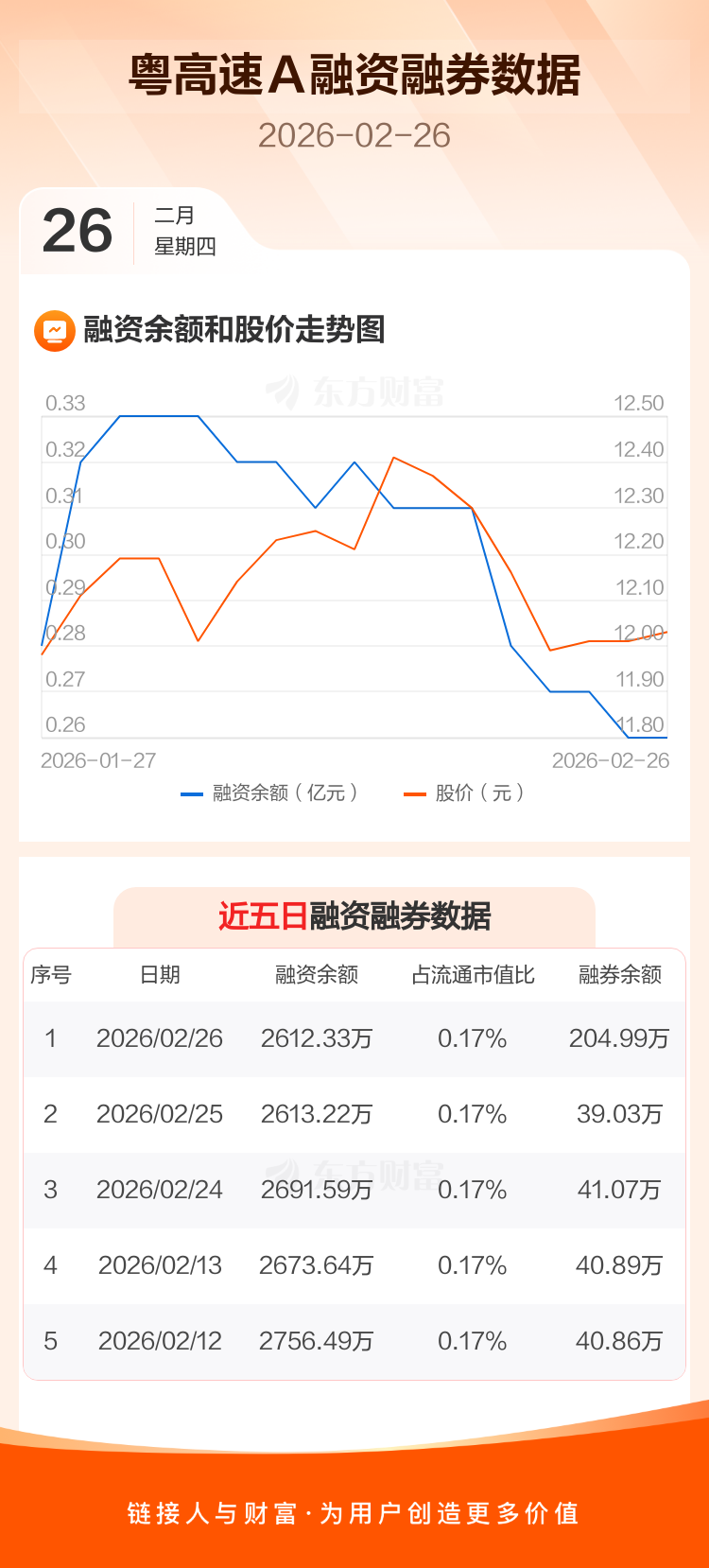 交易所最新数据显示,粤高速A于2026年2月26日获融资买入141.22万元,融资偿还142.12万元,当日融资净偿还8960元。目前,该股融资余额2612.33万,占流通市值比例为0.17%。