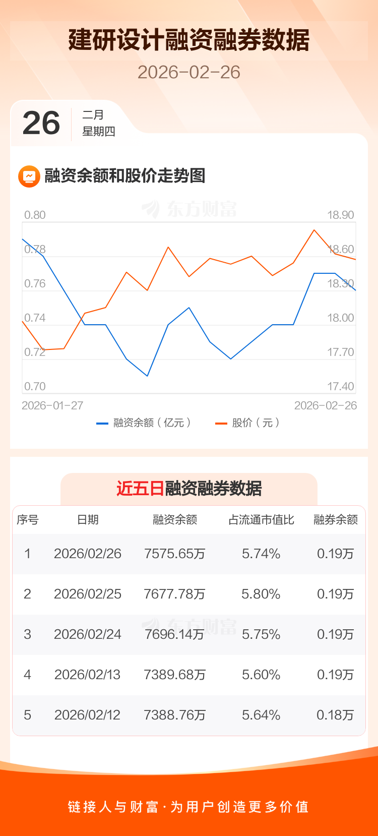 交易所最新数据显示,建研设计于2026年2月26日获融资买入255.45万元,融资偿还357.57万元,当日融资净偿还102.12万元。目前,该股融资余额7575.65万,占流通市值比例为5.74%。