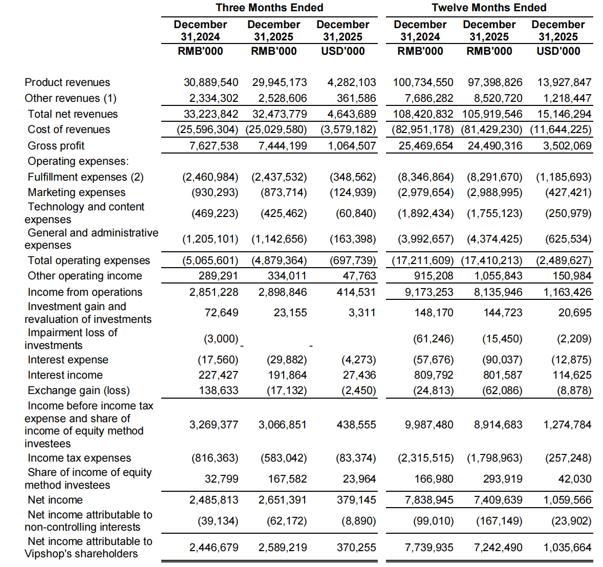 2月26日,唯品会发布2025年四季度及全年未经审计财务业绩。根据财报,唯品会2025年四季度实现总净营收325亿元,同比减少2.11%;归母净利润26亿元,同比增长5.8%。