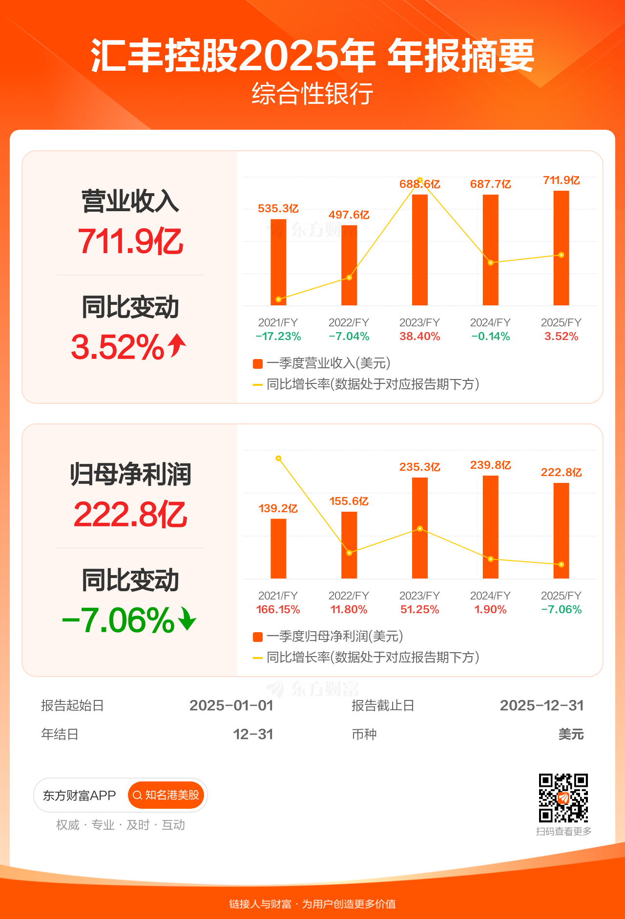 汇丰控股2月25日发布年报业绩,截至2025年12月31日的12个月内,该公司营业收入711.85亿美元,同比增长3.52%;公司权益持有人应占溢利(归母净利润)222.85亿美元,同比减少7.06%。