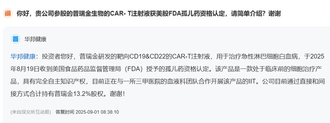 普瑞金研发的靶向CD19&CD22的CAR-T注射液,用于治疗急性淋巴细胞白血病,于2025年8月19日收到美国食品药品监督管理局(FDA)授予的孤儿药资格认定。该产品是一款处于临床前的细胞治疗产品,具有完全自主知识产权,目前正在与一所三甲医院的血液科团队合作开展该产品的IIT。