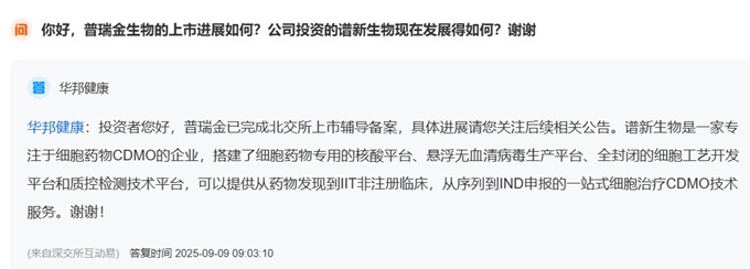 公司持股13.2%的普瑞金已完成北交所上市辅导备案,具体进展请您关注后续相关公告。谱新生物是一家专注于细胞药物CDMO的企业,搭建了细胞药物专用的核酸平台、悬浮无血清病毒生产平台、全封闭的细胞工艺开发平台和质控检测技术平台,可以提供从药物发现到IIT非注册临床,从序列到IND申报的一站式细胞治疗CDMO技术服务。