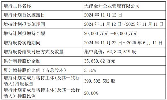 2025年金开新能控股股东完成了增持计划。相关公告显示,2024年11月22日至2025年6月11日,公司控股股东天津金开企业管理有限公司以集中竞价方式,增持公司股份数量约6282万股,累计增持股份金额高达约3.57亿元,增持均价约为5.67元。相较于2月27日上午涨停价7.39元,控股股东增持股份浮盈比例达30%。