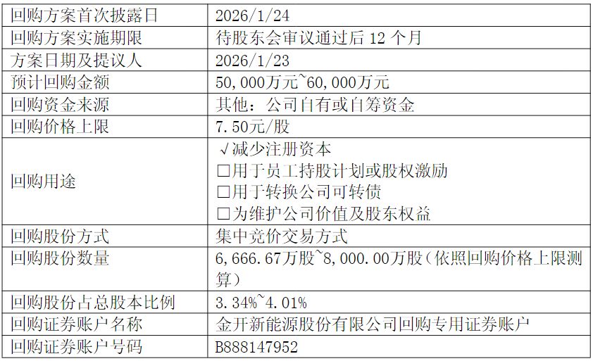 2月25日晚间,金开新能发布了关于以集中竞价交易方式回购公司股份的回购报告书。回购报告书显示,公司回购股份金额为不低于5亿元(含)且不超过6亿元(含),回购股份价格为不超过7.50元/股(含),依照回购价格上限测算,公司回购股份占总股本的比例在3.34%至4.01%。值得注意的是,金开新能本次回购的股份将全部予以注销并减少公司注册资本。