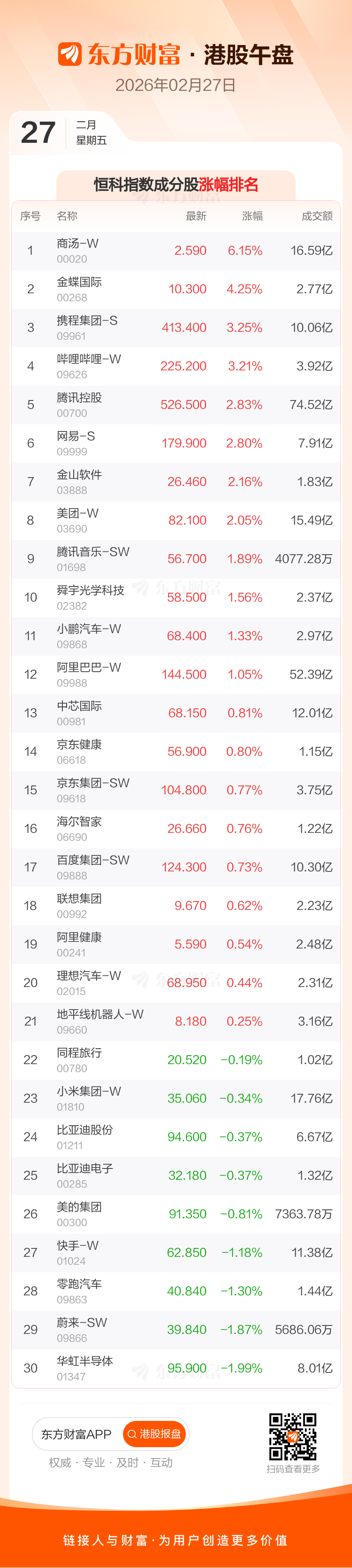 港股2月27日午盘走高,恒生指数收报26578.03点,涨197.01点,涨幅0.75%;恒生科技指数收报5162.34点,涨53.01点,涨幅1.04%。恒生指数成分股中新鸿基地产、药明生物、携程集团-S涨幅居前,长和、康师傅控股、中国生物制药跌幅靠前。恒生科技指数成分股中商汤-W、金蝶国际、携程集团-S涨幅居前,华虹半导体、蔚来-SW、零跑汽车跌幅靠前。