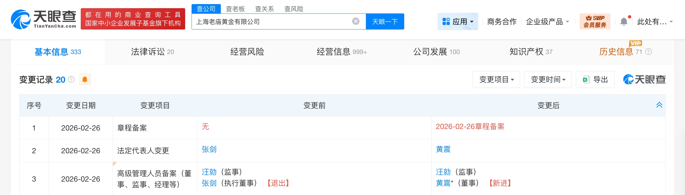【大河财立方消息】天眼查App显示,近日,上海老庙黄金有限公司发生工商变更,张剑卸任法定代表人、执行董事,由黄震接任法定代表人并担任董事。