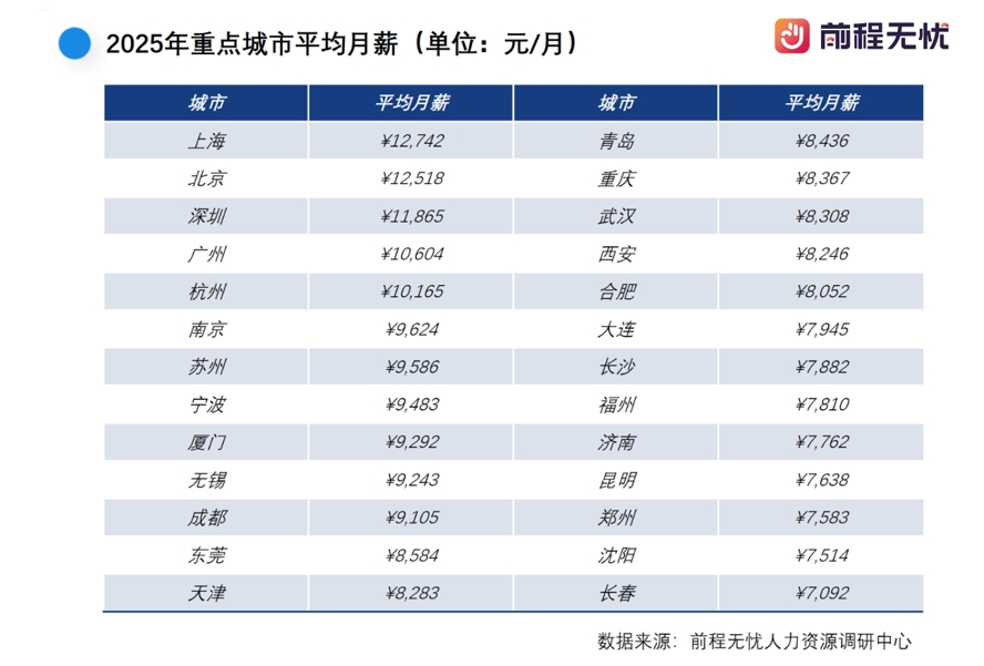 数据显示,在2025年全国重点城市月薪统计排名中,一线城市的薪资排名优势明显,其中上海(12742元/月)和北京(12518元/月)表现最为突出,这反映出高新产业及高级人才密度对薪酬的强大支撑。