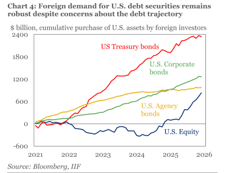 IIF表示,尽管市场对美国的疲软财政状况表示担忧,但美国国债作为长期避险资产的地位仍在延续。与此同时,由于美国经济活动表现稳健,外国投资者对于美国资产(包括国债、股票和公司债券)的需求依然强劲。这与近期“外资因投资分散化和去美元化而撤离美国”的说法形成了鲜明对比。