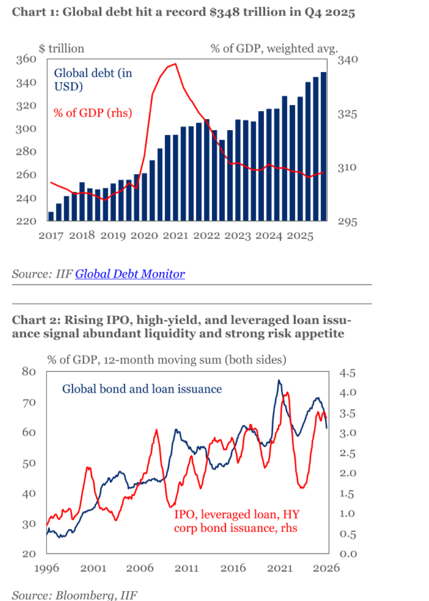 国际金融协会(IIF)日前发布的报告显示,2025年全球债务总额增加了近29万亿美元,全球债务总规模达到创纪录的348万亿美元。