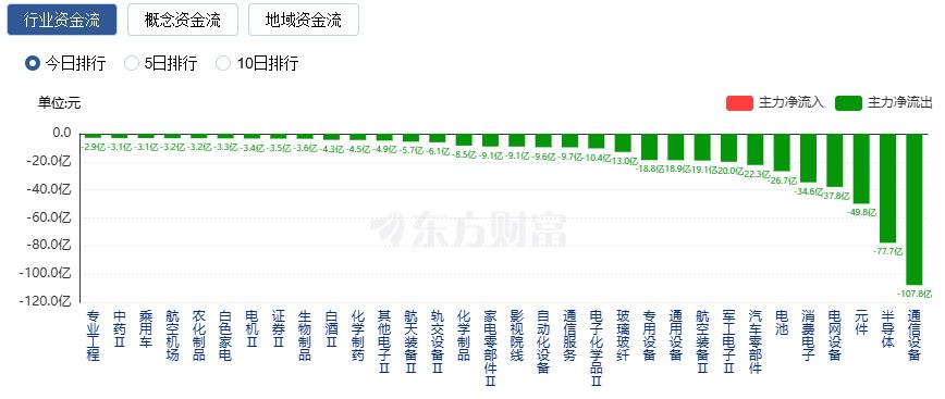 净流出方面,通信设备、半导体、元件等净流出排名靠前,其中通信设备净流出107.8亿元。
